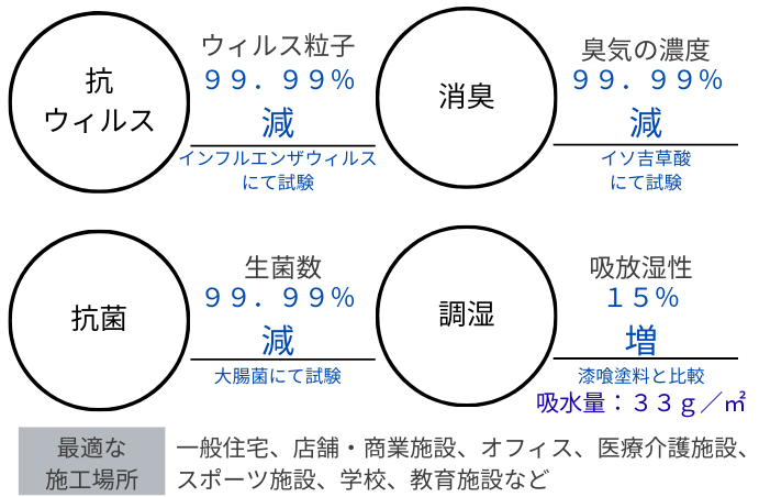 ハイカルコート PRMIERE -anti mold- HIGHCAL COAT PRMIERE -anti mold- ハイカルコートは高反応消石灰により、機能性と美観を追求した塗料です。日本の伝統、漆喰の壁で美しく衛生的な空間を提供します。 抗ウィルス高反応消石灰塗料 漆喰の主原料は「消石灰」。ハイカルコートは石灰製品メーカーとして70 余年の歴史を持つ田沢工業(株)の協力により開発され塗料です。消石灰が持つ抗ウイルス、抗菌、消臭、調湿などの機能を「高反応消石灰」と呼ばれる反応性の高い消石灰により引き出しました。さらに、本来コテ塗りの技術が必要な漆喰を塗料化し、ローラー塗装を実現。従来の漆喰と比べ短時間で塗装が可能です。 ハイカルコートの主原料「高反応消石灰」とは 従来の漆喰に使われる消石灰 粒子が鉱石のような構造を持つ ※3000倍の電子顕微鏡写真 ハイカルコート(高反応消石灰) 粒子に多孔質構造を持たせることで反応性を高めた消石灰 快適な空間を提供する ハイカルコートの機能 漆喰の美観 紙や塗料とは違う、漆喰が持つ自然な風合いが上質な空間を演出。マットで多孔質な白壁が光と調和し、やさしい空間を作り出します。 原料へのこだわり 国内でも、純度の高い石灰石(高反応消石灰)を選び、品質と美観、機能性を追求しました。